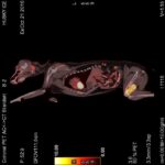 During clinical examination, a 6 year old, female Husky was determined to have a subcuteanous mass infiltrated in the muscle in the lumbo-dorsal region. Mass proved to be a malignant neoplasm in the fine needle aspiration biopsy. Cutaneous mass on the lumbo-dorsal region and the mass on the hind leg distal was operated on and sent for pathological examination. In addition to routine H&E staining, lumbal mass was applied CD79a (Biocare Medical, HM47/A9), CD3 (Syctek, PS1) and Ki-67 (Dako MIB-1) antibodies and immunohistochemical staining with streptavidin-biotin peroxidase method. Patient was dignosed with B cell lymphoma. 10 days after the operation left hind leg was limping and in pain and FDG PET/CT imaging was used. For PET/CT 2.8 mCi F18- was injected intravenously and we waited 60 minutes for it to spread. Images were taken to cover the whole body and reconstructed in axial, sagittal and coronal planes. Distal part of the femur showed retention. In order to protect the bone tissue, 3 dimensional radiation treatment with 8Gy/1 fraction with 6MV LINAC. For the patient who showed multiple retention in PET/CT Wisconsin lymphoma protocol was applied. 2 weeks into the protocol, patient developed pancytopenia, therefore instead of multiple medications, patient was administered a less aggressive chlorambucil-prednisolone which is recommended for indolent lymphomas. Doxycycline was added to the treatment protocol because of high IgG levels and pancytopenia, considering it might be a Ehrlichiosis related lymphoma although SNAP 4Dx Plus Test result was negative.